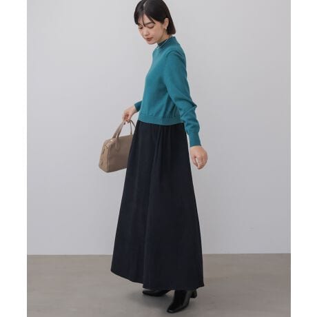 上半身は伸びやかで優しい着心地のニット、下半身はほどよい張りと立体感を出す布帛スカートという、魅力をかけ合わせたデザインです。配色のアクセントが大人の遊び心を引き出し、1枚で華やかに決まるのも嬉しいポイント。
