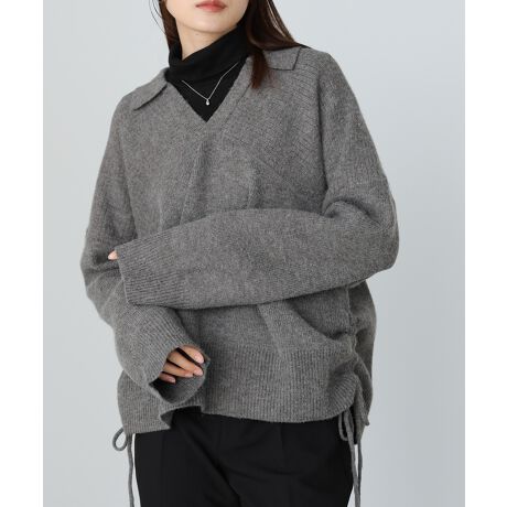 襟付きデザインにVネックを掛け合わせた、抜け感のあるニットトップス。サイドのドロストリボンがアクセントになり、シンプルながらもさりげない可愛さをプラスしてくれます。すっきりとしたネックラインで顔まわりが明るく見え、きれいめにもカジュアルにも馴染む万能アイテムです。
