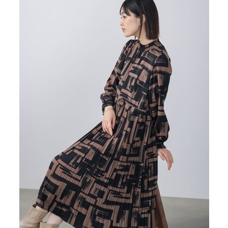 モード感漂うブロック柄が印象的なロングワンピース。直線的な柄デザインがスタイリッシュな雰囲気を演出し、甘くなりすぎず大人っぽく着こなせます。フロントボタン仕様で、ワンピースとしてはもちろん羽織りとしても活躍する1枚です。
