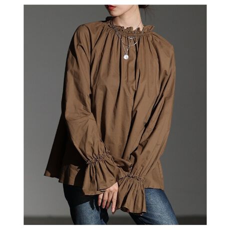 【トップス】 ブラウス フリルネック ベルスリーブ フレア ギャザー プルオーバー 黒 白 茶色