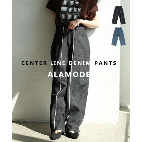 フロントに伸びたフリンジのセンターラインが脚長効果抜群、ヒトクセ効いたデニムパンツです。ワイドシルエットで脚のラインを拾わないところも嬉しいポイント◎ストンとした落ち感は脚を通すだけでこなれ感を演出できます!