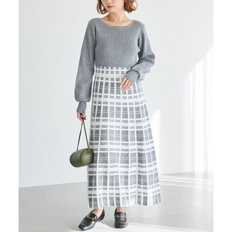 上半身はシンプルな無地リブニット、スカート部分はジャガードチェックプリーツで動きのあるスタイルに。