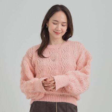 ふんわりとした素材感と、ざっくりと編まれた透かし柄が印象的なニット。
