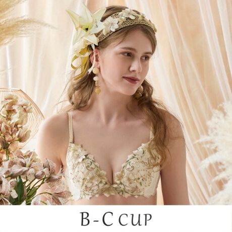 前中心が低いワイヤーとカップのサイドパネルで、バストを中央に寄せて美しいV字を演出します。カップは4枚接ぎ構造でよりバストにフィットし、やさしい着け心地のパターンです。