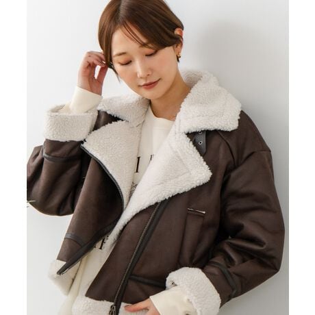 大き目の襟が目を惹くフェイクレザージャケット。