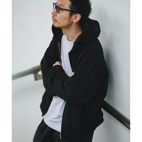アーティストが愛用した当時のアメリカンスウェットにインスパイアされつつ、国内工場でタフな裏毛生地を使用し、現代的なシルエットに再構築。