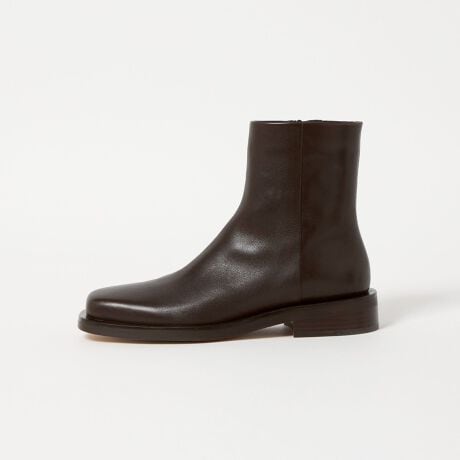 マニッシュな雰囲気を漂わせる長めのノーズと厚みのあるスクエアトゥを掛け合わせたショートブーツ。