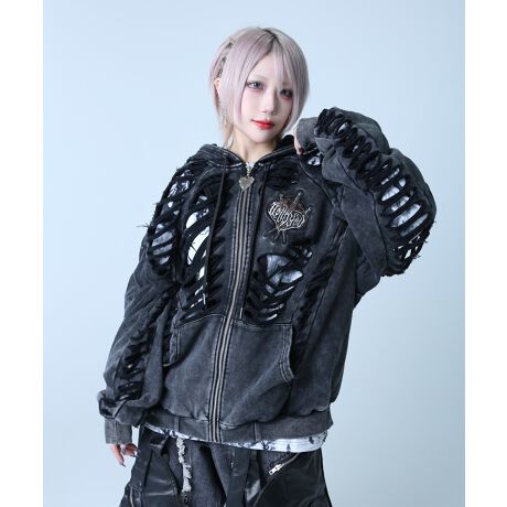 BACKSTAGEPASS(バックステージパス)の DESTROY HOODIE-VEIN(デストロイフーディー ヴェイン) スケルトンダメージ ジップアップ クラッシュパーカーです。