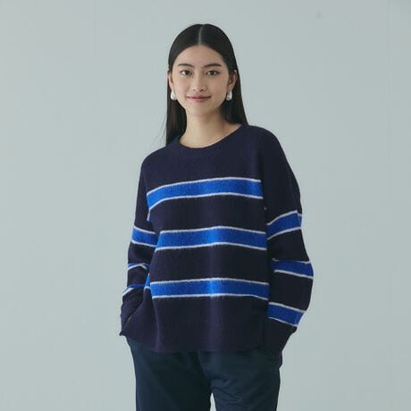 ウールを含む5者混の糸を使用し、表面に起毛感を持たせた編地が特徴のミックスカラーボーダーのウール混ニットプルオーバーです。