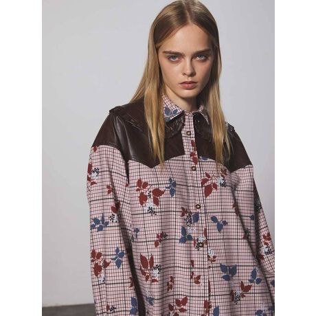 ビンテージ加工の入ったエコレザーと、チェックと花柄を組み合わせた華やかなオリジナルプリントを切り替えた、一際目を引くキャッチーなオーバーシャツ。