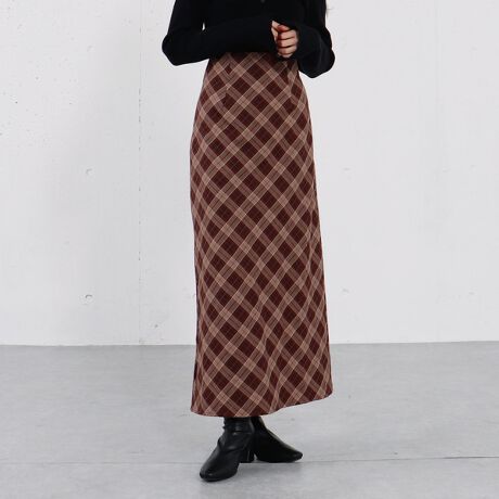 バイアスに配置したチェック柄が、縦のラインを強調してくれるナロースカート。