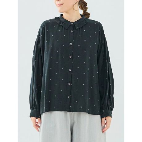 [型番:25410689507]ドット柄のプリントが可愛らしい印象を与えるブラウス。襟にはひらりとしたフリルを施しており、スタイリングのアクセントになります。コットンレーヨンを使用したやさしい生地が魅力的。休日のお出かけやタウンユースにも大活躍してくれるアイテムです。Hare no hi/ハレノヒ