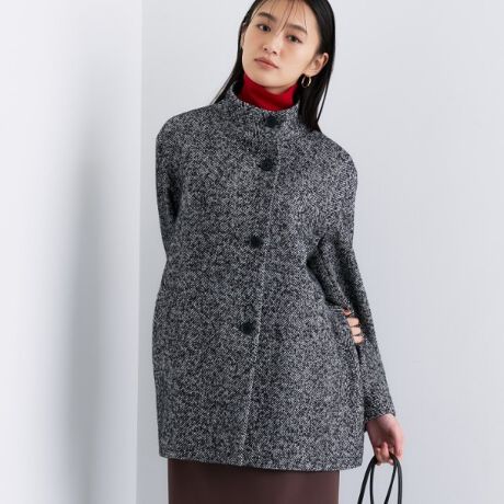 顔回りから少し余裕を持たせたスタンド衿と、釦アクセントがポイントのコートです。