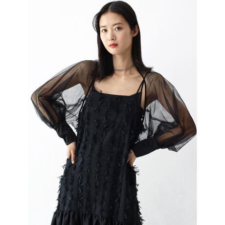 繊細で編み目の細かいチュールを使用したシアーボレロ。とても軽い素材で伸縮性に優れ、シアー感がヘルシーな肌見せを演出し、女性らしさを兼ね備えた一枚。