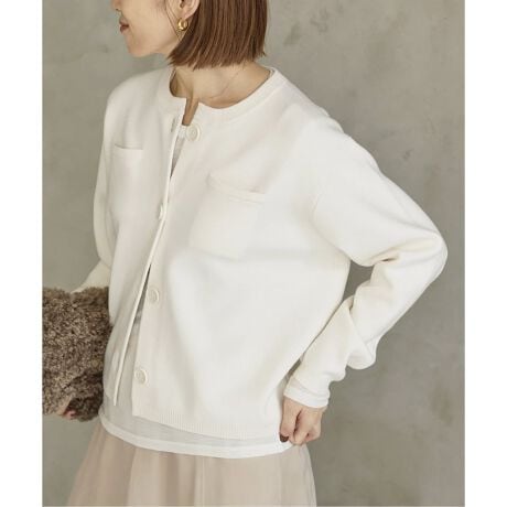 超細番手のウールとポリエステルをスムース編みにしたIENAの定番素材を使用したカーディガン。