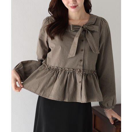 チェック柄×ボウタイが華やかなペプラムブラウス。