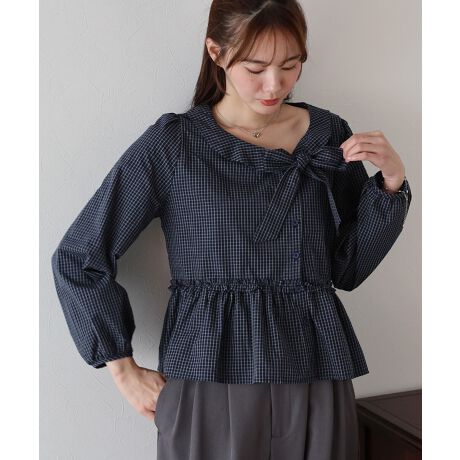 チェック柄×ボウタイが華やかなペプラムブラウス。