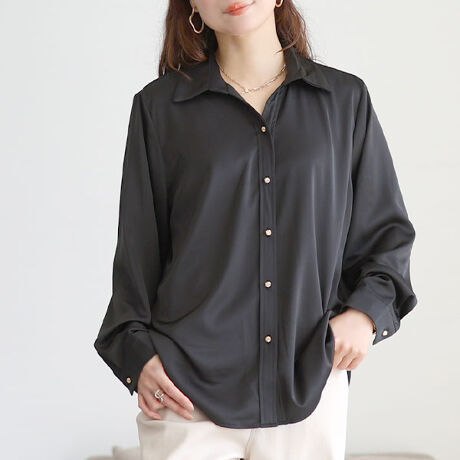 上品な抜け感と女性らしさを両立したスキッパーブラウスです。深めのVラインが美しく開くスキッパーネックが顔まわりをすっきり。程よいゆとりのある身幅と前後差のある丈感が自然にボディラインを整えます。前は腰が隠れるほどの丈でバランスよく着られ、後ろはヒップラインをカバーして安心感も◎。シンプルながらゴールドボタンがアクセントになり、どんなボトムにも品よくマッチします。デスクワークや通勤、休日のお出かけにも快適に使えます。きちんと感と抜け感を両立した大人のきれいめスタイルをこのブラウスでぜひ楽しんでください。