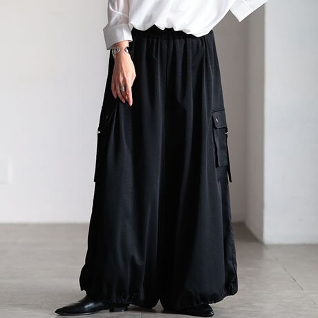 最大の魅力は、裾に配されたドローコードと、ゆったりとしたワイド幅のシルエット。ドローコードを絞らずに穿けば、ストンと落ち感のあるリラックスしたワイドストレートに。裾をキュッと絞れば、丸みを帯びたバルーンシルエットに変わり、足下にメリハリをつけます。ゆったりボリューム感のあるシルエットで、一日中ストレスフリー。穿くだけで下半身をカバーしてくれるボリューム感がありながらも、ロング丈で縦ラインを強調し、すっきり見え。幅広のウエストゴムがしっかりお腹周りにフィットします。