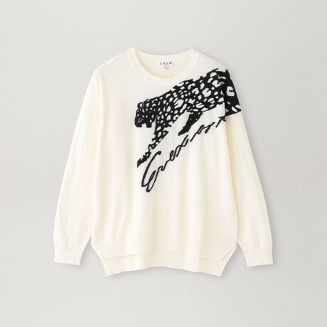 パンサーモチーフとEvex by Kriziaのロゴを融合させたインパクトあるインターシャのニットプルオーバー。パンサーモチーフとロゴ部分には、ラメのフェザーヤーンで立体感、存在感をプラス。1枚で存在感のあるボックスシルエットで、モードなスタイリングに仕上げ、パンツとも好相性。