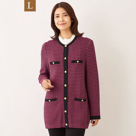 ノーカラーで配色使いが映える、千鳥柄のミドル丈ニットカーディガン。ボトムを選ばず、幅広いコーディネートに活躍する羽織りアイテムです。