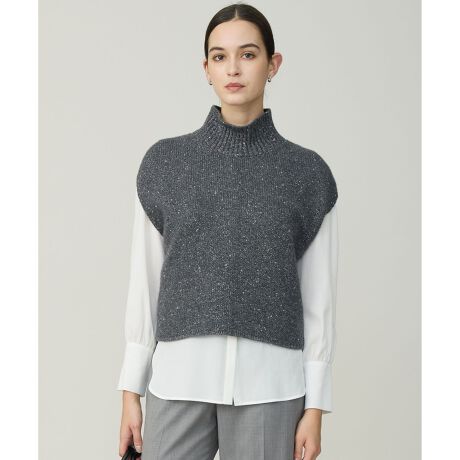 ■デザインスタイリングのアクセントとして使えるハイネックニットベスト。ベーシックなトップスなどに重ねるだけで一気に華やぎ、今年顔のワンランクアップしたスタイリングが完成します。ハイネックで暖かく、ラウンドヘムで軽やかなエッジをプラスしました。スタイリングのワンポイントとしても、防寒としても大活躍するトッピングアイテムです。