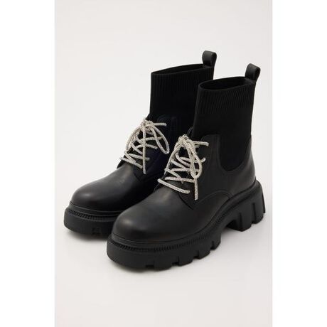 [型番:350IA124-4500]STACCATO定番&人気のきらきらリボン!に、新デザインのブーツが登場。モードな雰囲気のニットコンビブーツに華やかなコードストーン付シューレースがポイント。軽量タンクソールでスニーカー×ブーツのような履き心地。マニッシュなスタイルにはもちろんのこと綺麗目なスタイルにもカジュアルすぎず、足元をさり気なく高感度に魅せてくれます。※シューレースはデザインです(調節不可)。ストーン装飾への衝撃等にご注意ください。