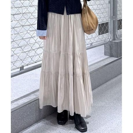 シャイニーな光沢感が可愛らしいサテンティアードスカート。縦に落ちるギャザー感と3段ティアードデザインは、裾に向かって広がるボリュームラインが華やかな印象。ウエストはぐるりゴム仕様なので、ストレスフリーなはき心地です。ボリュームニットやスウェット合わせで、カジュアルライクな着こなしがおススメ。短丈トップスを合わせてもバランスよく着ていただけます。※モデルの着用画像の場合、光の当たり具合により、実際の色味と異なって見えることがございます。色味は、商品単体の画像をご参照ください。