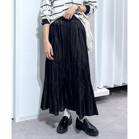シャイニーな光沢感が可愛らしいサテンティアードスカート。縦に落ちるギャザー感と3段ティアードデザインは、裾に向かって広がるボリュームラインが華やかな印象。ウエストはぐるりゴム仕様なので、ストレスフリーなはき心地です。ボリュームニットやスウェット合わせで、カジュアルライクな着こなしがおススメ。短丈トップスを合わせてもバランスよく着ていただけます。※モデルの着用画像の場合、光の当たり具合により、実際の色味と異なって見えることがございます。色味は、商品単体の画像をご参照ください。