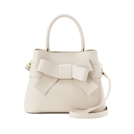 フロントにあしらったリボンが愛らしいバッグ。中央で2部屋に仕切られたデザインで、中身が見やすくなっています。