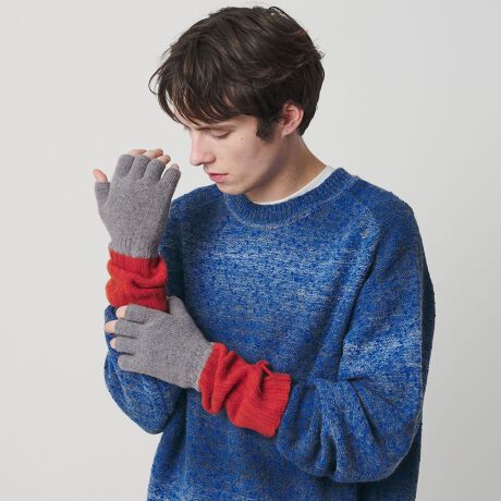 バイカラーのレイヤード風デザインは、上側を裏返すと肘下まで包み込む暖か仕様です。