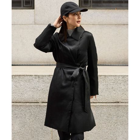 上品な光沢感とステッチを入れないデザインがエレガントなダブルのダウンコート■デザインスタイルを選ばないダブルのデザインのダウンコートです。程よい光沢感のあるサテン素材にあえてステッチを入れず作ることで、エレガントな印象ですっきりと着て頂けます。小さいゴールドのドット釦を使用しており、前を開けてもきらりと光る釦が高級感を演出してくれます。程よい長さの着丈でケージョンシーンでも着て頂けるようお作りしました。防寒のために下の襟を釦で留めて着て頂くことも可能です。袖口は風を通しにくい仕様にしており、ポケットの内側は起毛素材を使用することで手を入れた時に冷たさを感じにくいよう細部にまでこだわり抜いたデザインです。