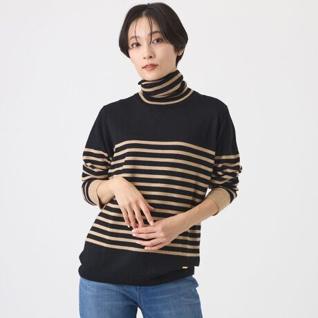 バイカラーで変化をつけ2枚仕立てにしたタートルネックがポイントのニットプルオーバー。袖口も衿に合わせた配色でアクセントにしています。身頃は程よくゆとりのあるシルエットでバランスよく仕上げました。色によって、無地とボーダーで展開します。