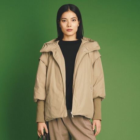 ステッチレスでスポーティーな雰囲気の軽量ダウンジャケットに、袖取り外し可能なギミックを加えました。袖を外すとダウンジレになり、2WAYで楽しんでいただけます。柔らかな丸みのあるフォルムと、袖口のロングリブがアクセントに。