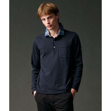 襟には同シリーズのメランジチェックシャツの素材を使用し、アクセントに。スプリットラグランの肩まわりは動きやすくフィット感が良い設計です。