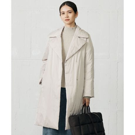 上品な光沢感とステッチを入れないデザインがエレガントなダブルのダウンコート■デザインスタイルを選ばないダブルのデザインのダウンコートです。程よい光沢感のあるサテン素材にあえてステッチを入れず作ることで、エレガントな印象ですっきりと着て頂けます。小さいゴールドのドット釦を使用しており、前を開けてもきらりと光る釦が高級感を演出してくれます。程よい長さの着丈でケージョンシーンでも着て頂けるようお作りしました。防寒のために下の襟を釦で留めて着て頂くことも可能です。袖口は風を通しにくい仕様にしており、ポケットの内側は起毛素材を使用することで手を入れた時に冷たさを感じにくいよう細部にまでこだわり抜いたデザインです。