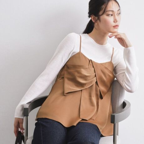 ・フロントにアシンメトリーなリボンデザインをあしらった。ビスチェ風デザインのキャミブラウス。