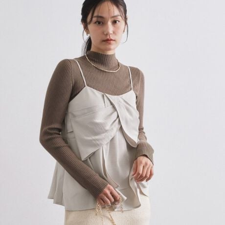 ・フロントにアシンメトリーなリボンデザインをあしらった。ビスチェ風デザインのキャミブラウス。