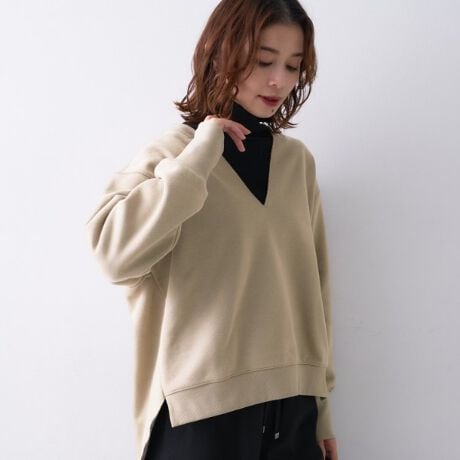 珍しいVネックの裏毛プルオーバーは、ほどよい抜け感で大人っぽく着こなせる一枚。