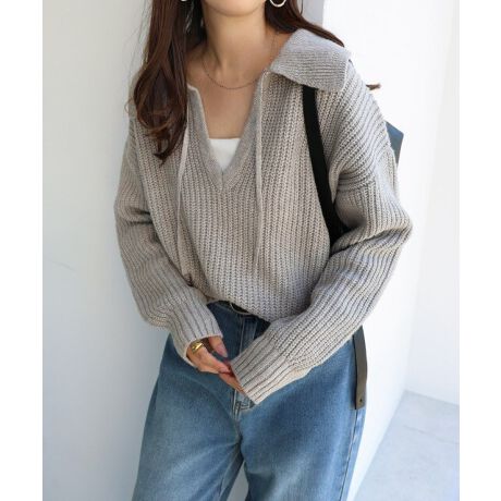 ボリューム袖 スキッパー ニット トップス