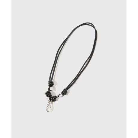 ロックミシンで緻密なステッチが施された、太さ5mmの丸レザー紐を使用したフォンストリング。ブランドで定番的に展開しているスライド式の調整が可能な革紐を採用しています。メタルのエンドパーツや刻印入りのオリジナルフックが、特別な存在感を醸し出します。