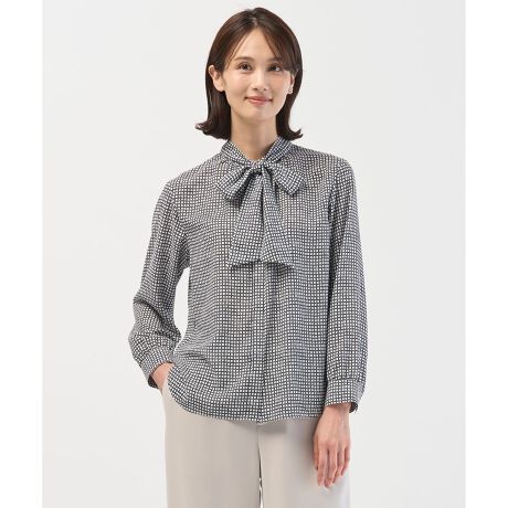 ■デザインバンドカラーに比翼仕立てを取り入れた、エレガントな印象の前開きブラウス。台襟とカフス部分にはパール釦を配して、華やかなアクセントをプラスしました。付属のボウタイは取り外し可能で、シーンに合わせて表情を変えて楽しめます。変形チェック柄がトラッドらしい雰囲気を与え、スタイリングにアクセントをプラス。オケージョンから通勤スタイルまで、幅広いシーンに使えるアイテムです。