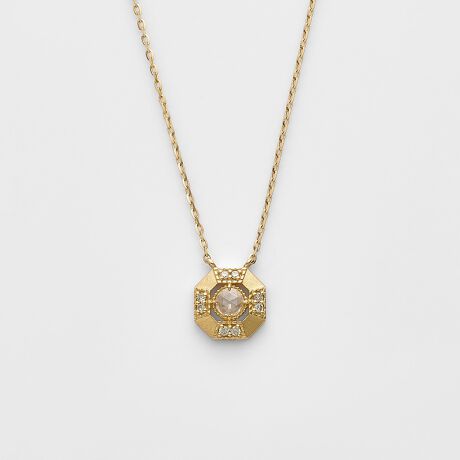 幸運を引き寄せる、八角形のダイヤモンドネックレス。古くから幸運を引き寄せるといわれる八角形のフォルムに、優しい輝きを放つローズカットダイヤをセット。四方にあしらわれたメレダイヤが繊細に煌めき、マットなテクスチャーとのコントラストが洗練された印象を叶えます。自分だけの特別なお守りのように、毎日のコーディネートに身に着けていただきたいアイテムです。※天然石や天然素材を使用しているものは、サイズ・色味・風合いの違いや、若干の傷、内包物の有無などに個体差があります。予めご了承ください。