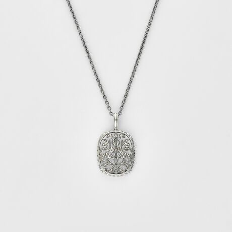 アンティークの気品を纏う、シルバー透かしのダイヤモンドネックレス。メレダイヤの輝きと、全体に施された燻し加工のコントラストが、華美になりすぎず、上品な輝きを演出します。チャームは取り外し可能な仕様で、他のチャームとの組み合わせや、ゴールドチェーンとの組み合わせなど自由なアレンジが楽しめます。日常のコーディネートに気品を添える洗練されたジュエリーをぜひお楽しみください。※天然石や天然素材を使用しているものは、サイズ・色味・風合いの違いや、若干の傷、内包物の有無などに個体差があります。予めご了承ください。※古美加工は個体差があります。