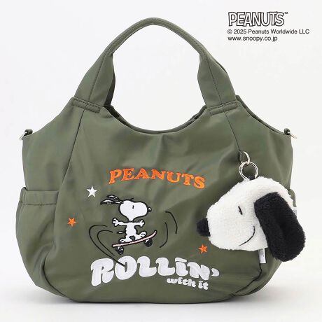気軽に使えるナイロン素材に前面のスヌーピーのイラストの刺繍をあしらい、スヌーピーのフェイス型もこもこミニポーチがセットになったアイテム。