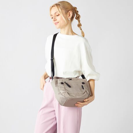 底部にタックをとってラウンド型のシルエットに仕上げたショルダーバッグ。
