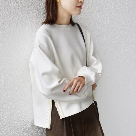 サイドスリットにフリルリボンをあしらった華やかなプルオーバーです。