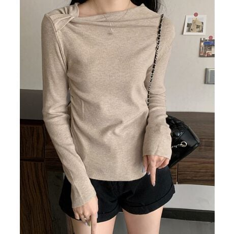 肩に入れたワンポイントのタックと、流れるようなドレープが美しいシルエットを演出するオフショルダーニットトップス。