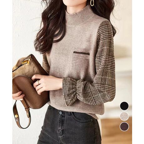 チェック柄の袖が目を引く、異素材ドッキングのハイネックニットトップス。