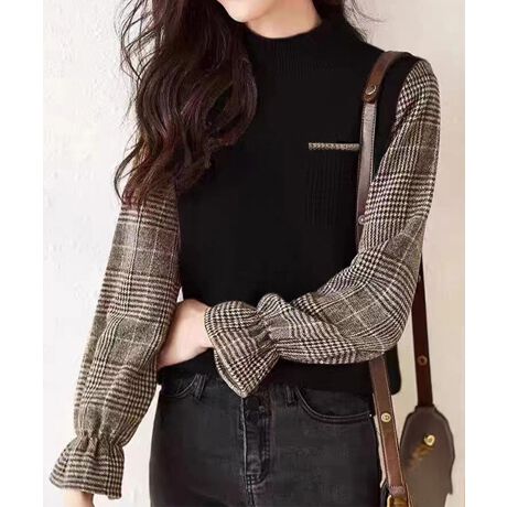 チェック柄の袖が目を引く、異素材ドッキングのハイネックニットトップス。